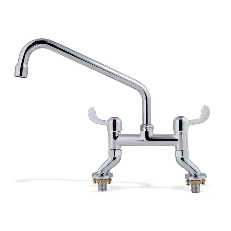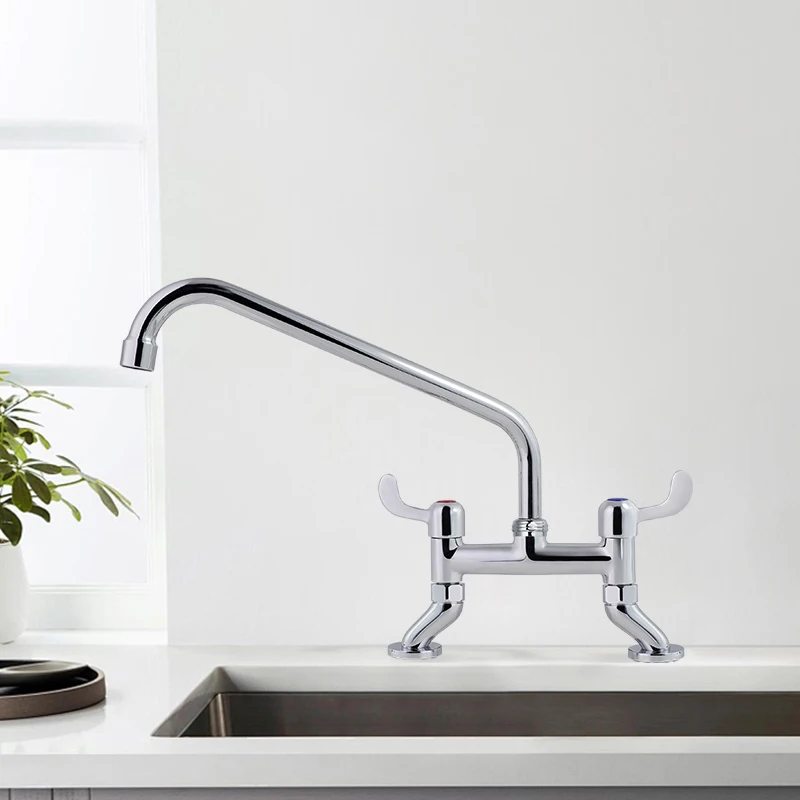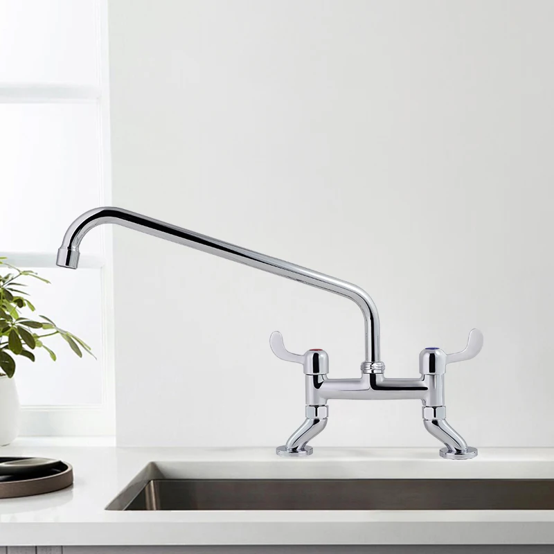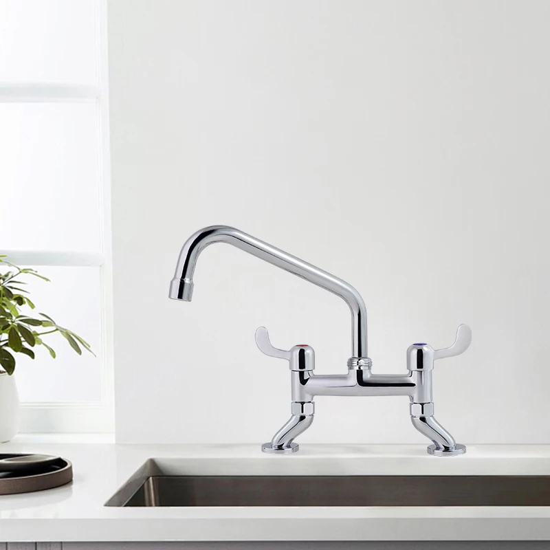 تحتوي صنبور المطبخ الحديث المصنوع من الفولاذ المقاوم للصدأ ذو المقبض المزدوج على هيكل دقيق التصميم بحجم 10 بوصة مع تركيب عبر فتحتين في سطح الحوض، وهو مصمم خصيصًا لأحواض المطابخ القياسية المستخدمة تجاريًا. ويضمن هذا الحجم الثابت تركيبًا سلسًا دون الحاجة إلى تعديلات على سطح الطاولة، مما يوفر على المشترين من الشركات الوقت وتكاليف العمالة أثناء الإعداد. ويُحسّن التصميم المثبت على سطح الحوض استخدام المساحة، حيث يبقي الأحواض خالية من الفوضى مع توفير ثبات قوي للاستخدام المتكرر. كما أن المسافة البالغة 10 بوصات بين المقابض توفر وصولاً مريحًا وسهل الاستخدام، مما يوازن بين الراحة والكفاءة — وهي ميزة بالغة الأهمية في البيئات عالية الازدحام مثل مطابخ المطاعم ومناطق ضيوف الفنادق.