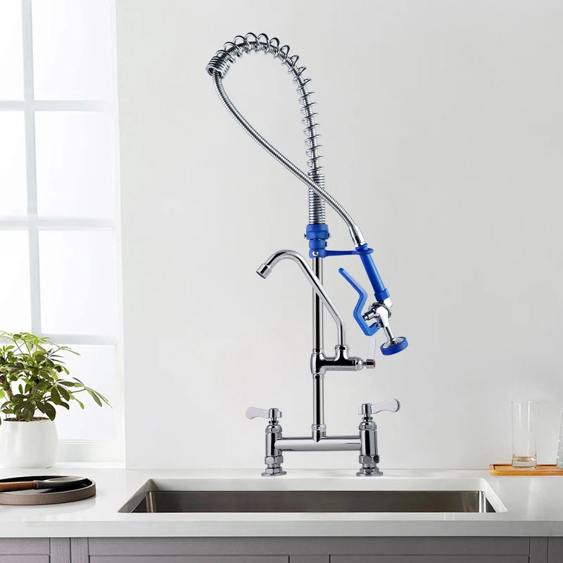 فاخر صنبور مطبخ تجاري للتمهيدي برشاش، مقبضان، هيكل من الفولاذ المقاوم للصدأ، تركيب على السطح، قاعدة من النحاس، صنبور صناعي للحوض بالماء الساخن والبارد